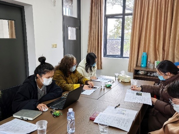接着,大家进行了主题研讨。李雅娴老师及时进行课后反思。李老师感到,教学中借助头套、实物触摸等道具提升了学生参与度,但在图片顺序编排、抽象词汇解读等方面仍需优化,后续将注重课时递进性设计与情感素养培养的结合。听课教师围绕教学实践各抒己见。大家肯定了道具运用与情境创设的成效,同时建议进一步优化教案重难点设置,通过中文标注辅助低年级学生理解,合理调整词汇教学的深浅度以便提升学生综合运用语言能力。最后教师们针对新教材词汇量大、课时紧张等问题,大家分享了跨学科融合、儿歌辅助等实用策略,并探讨了 iPad 等数字化工具的适配性应用。